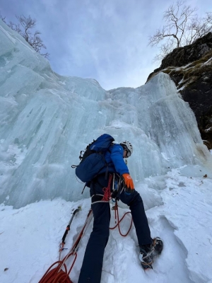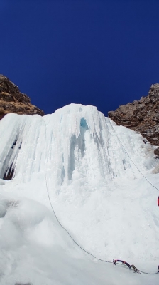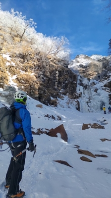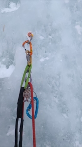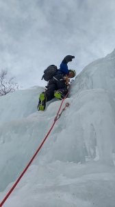 ここからは氷瀑F1は5m、F2は10m、F3?をアイススクリューで支点を取り、アックスと縦爪のアイゼンをしっかりきかせながら登攀します。