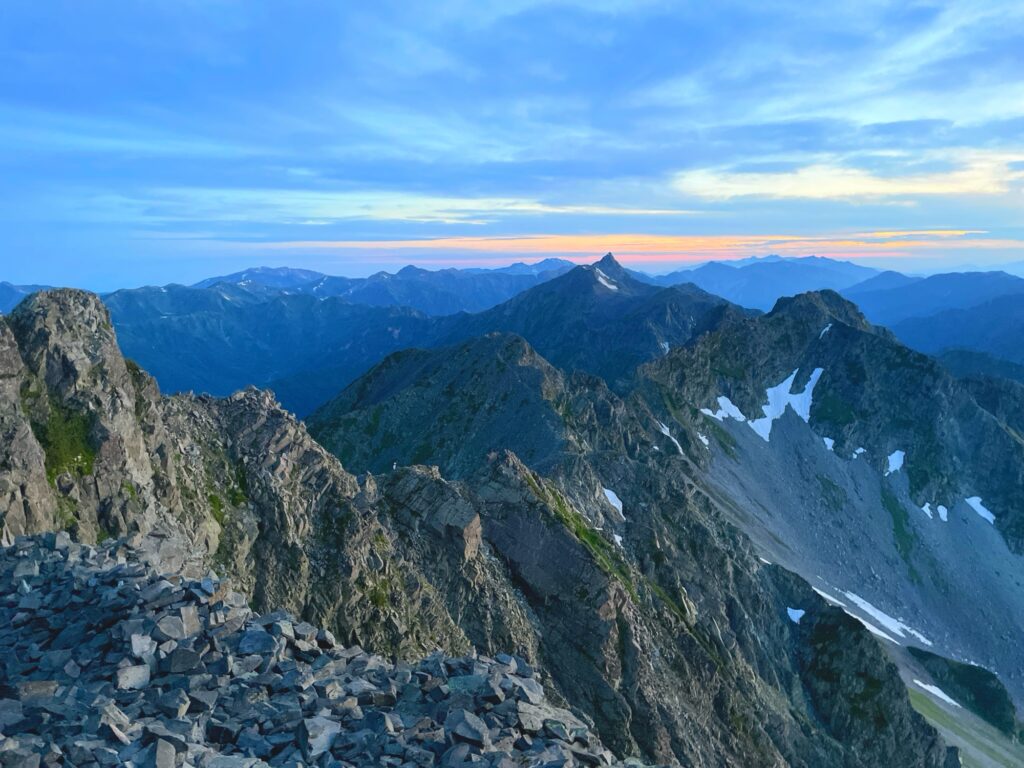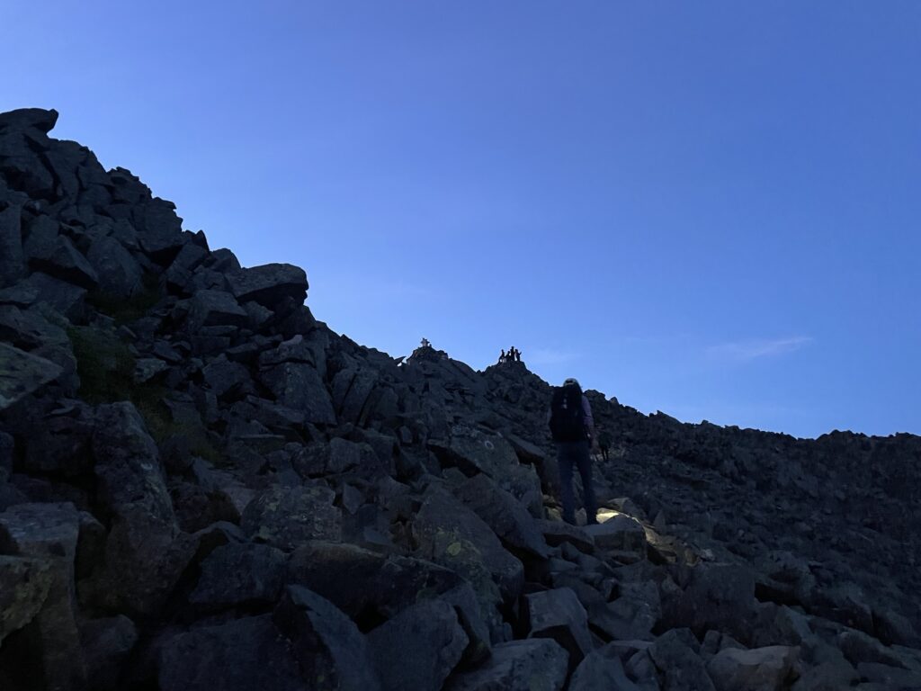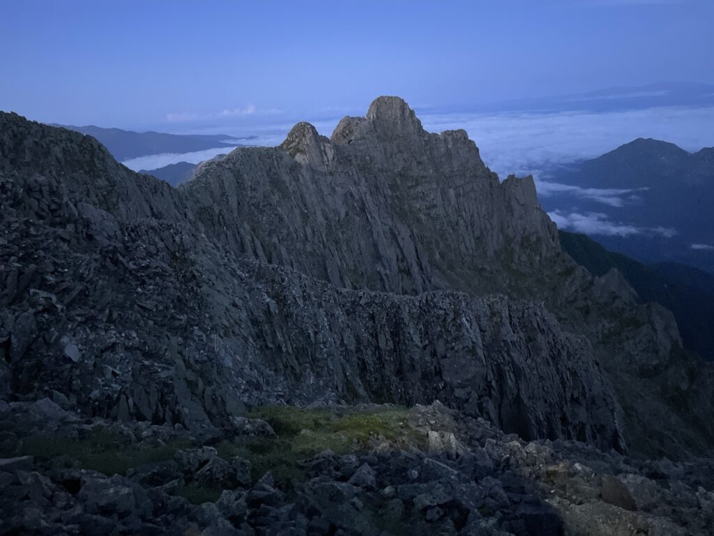 夜明け前から登頂の記念撮影で賑わう奥穂高岳山頂。山頂は結構狭いので、私らは立ち止まることもなく分岐を吊尾根方面へ。