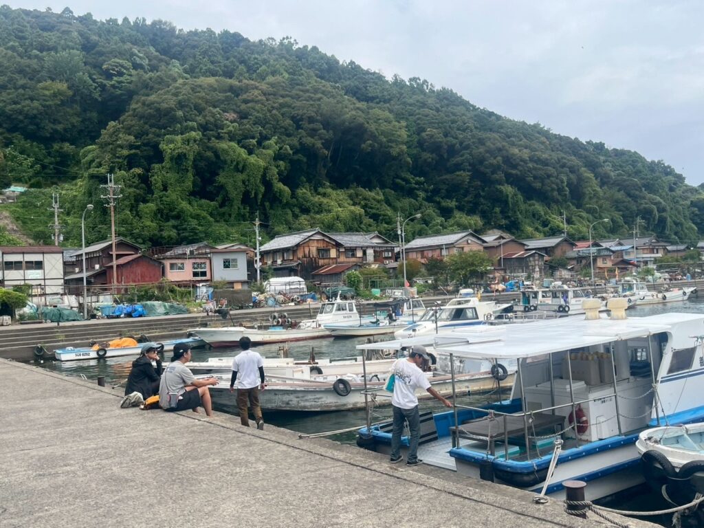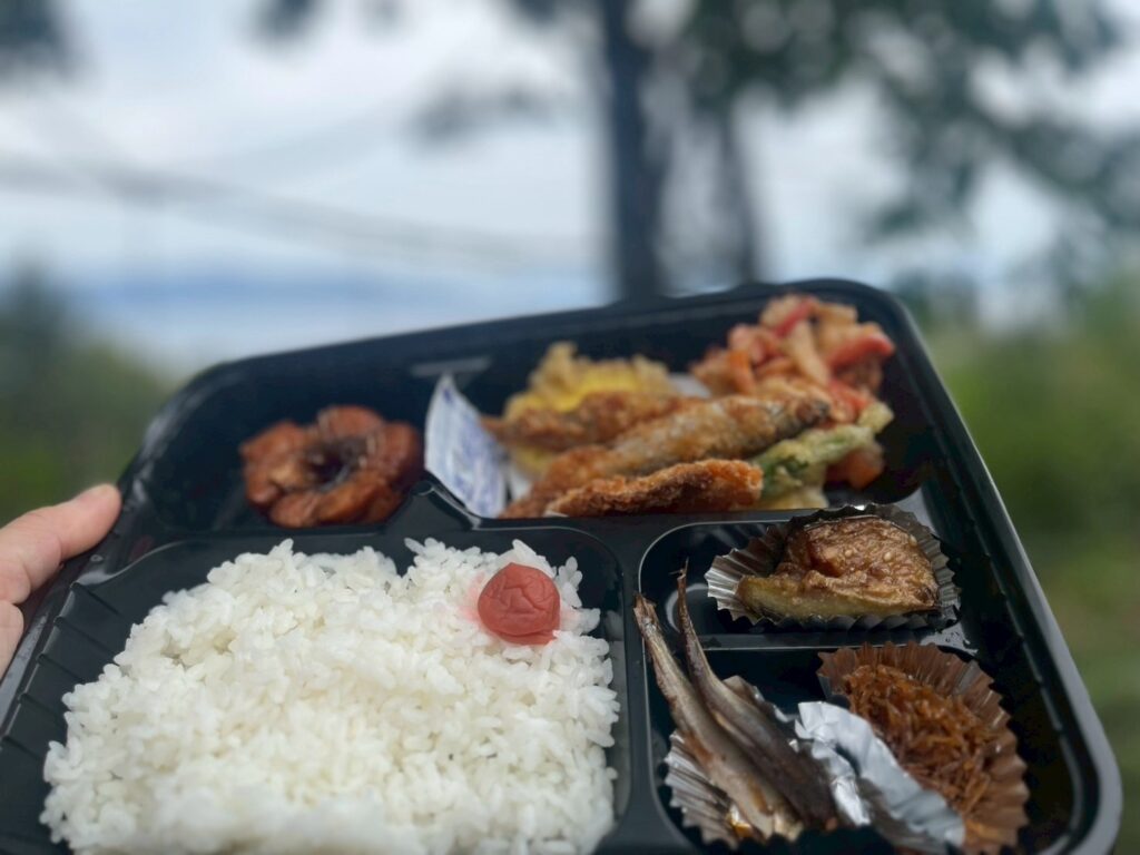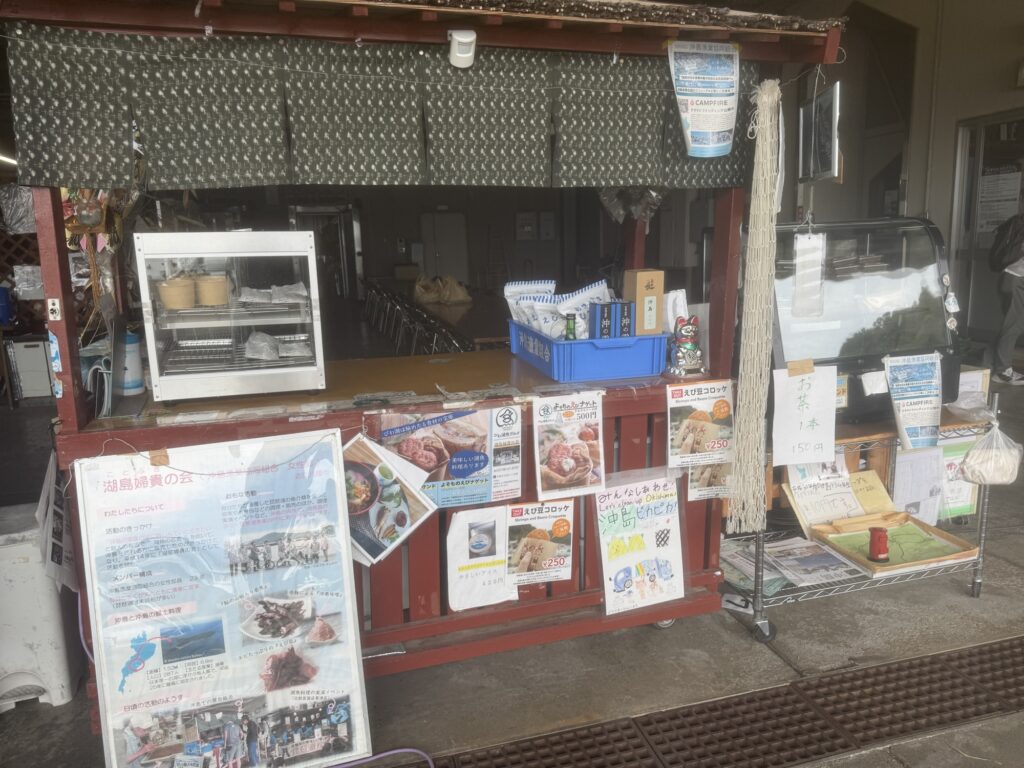 港の前の漁協の軒先に何やら美味しそうな食べ物が売っています。こちらでお弁当を受け取ります。(1500円)