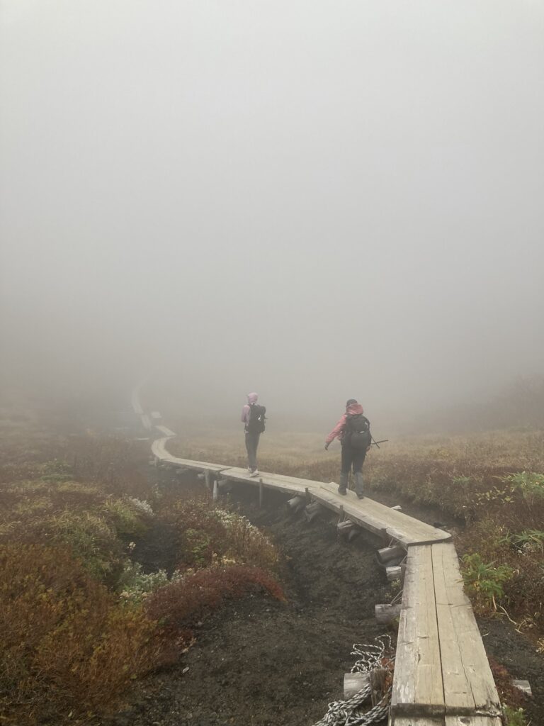 朝起きると雨こそ降ってないけど、やっぱり鉛色の空。そして今にも雨は降りそうです。朝ごはんを済まし、とりあえず出発です。一応、縦走しようと言う前提です。しかし、このまま進むか帰るかの最後の分岐のところで、リーダーからみんなの意思を最終確認。結局、安全を考慮してその日は下山することとなりました。この日は下山の後、乳頭温泉でお風呂に入った後、お昼ご飯に芋煮を食べ、コインランドリーで濡れたレインウェアなどを乾かし買い出しをして本日のお宿亀の井ホテルに到着。そうそう。途中で秋田の名物パパヘラアイスも食べました。