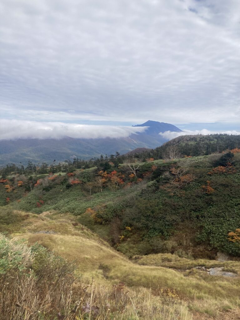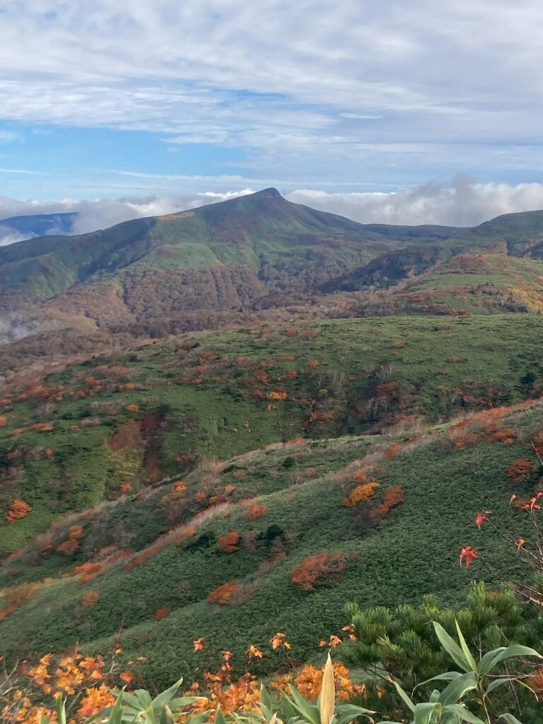 曇りとは言え、目の前にはやはり東北の美しい紅葉が広がります。関西の山とはずいぶん様子が違います。樹林帯ではなく、腰位の高さまでの笹に覆われているため、いつもよりも目線が低くなります。