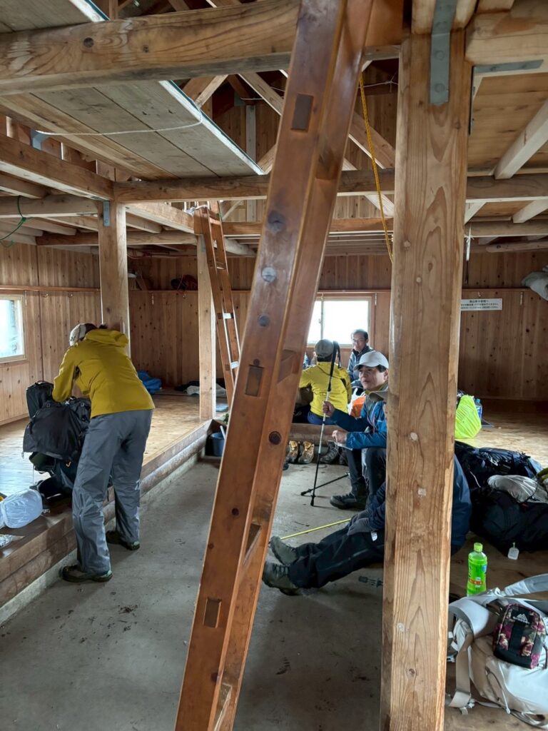 風も強かったので、避難小屋泊する気満々で扉を開けたものの満員御礼、一瞬でその期待は打ち砕かれ、静か~に後づさり…