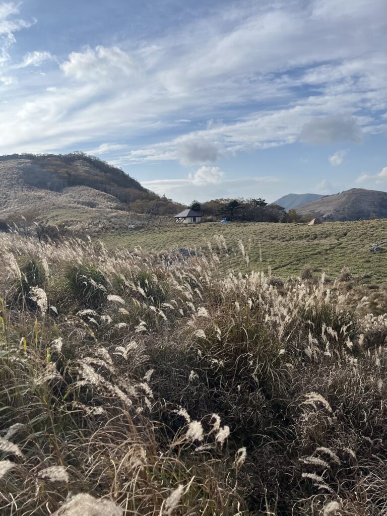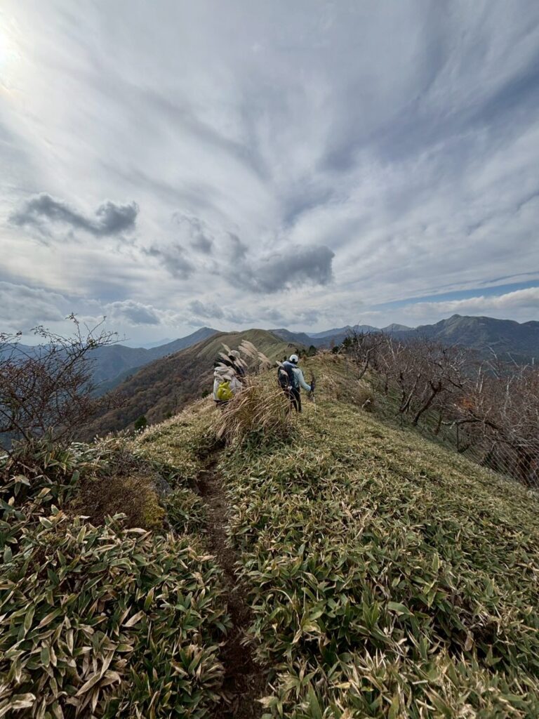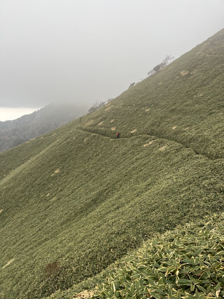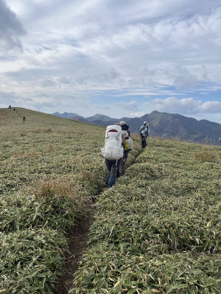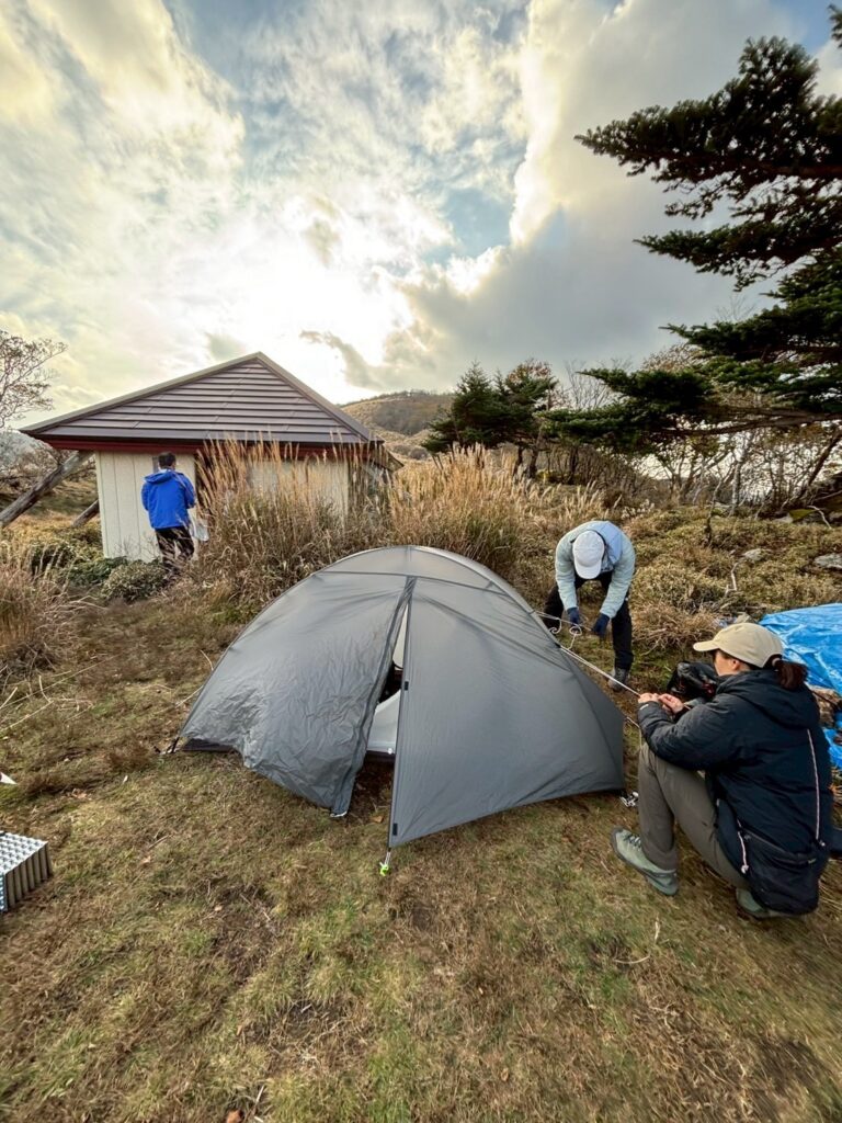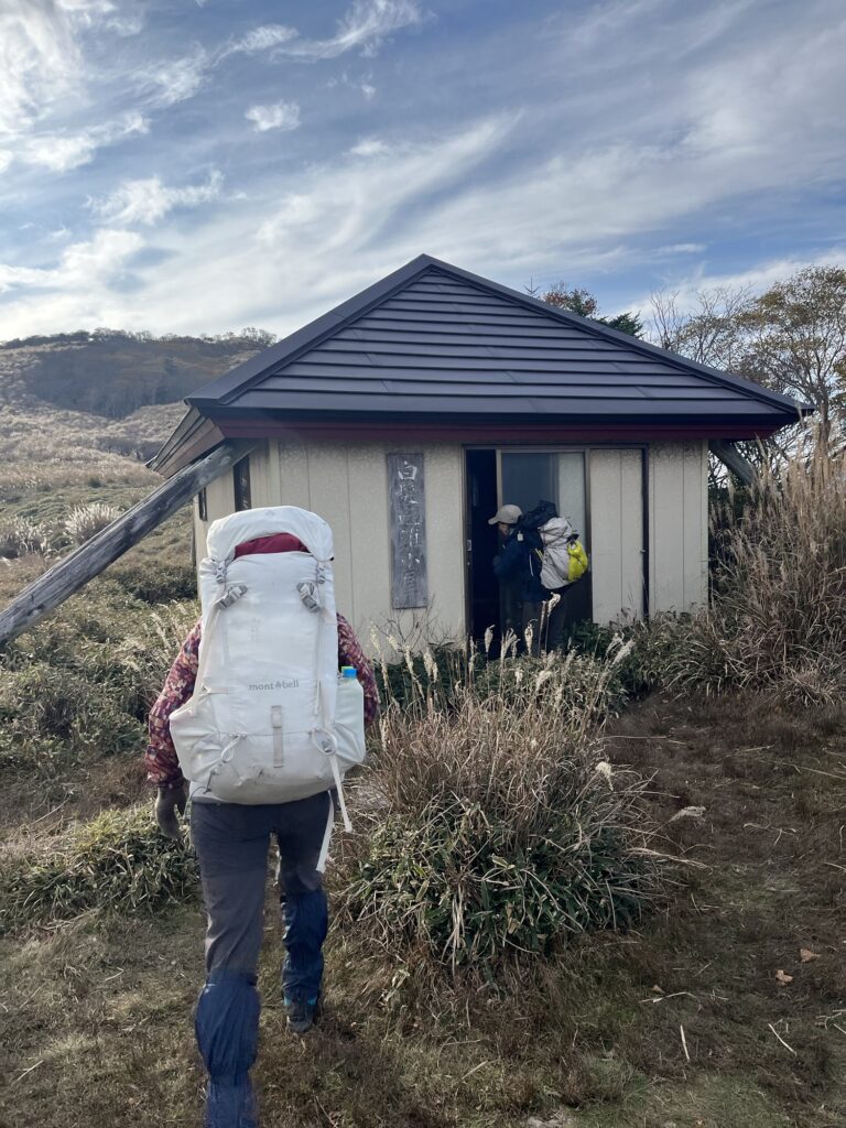 ひたすら続く笹ロードの稜線のアップダウンを繰り返し、いくつものススキ🌾の丘を越えようやく本日のお宿白髪避難小屋に到着