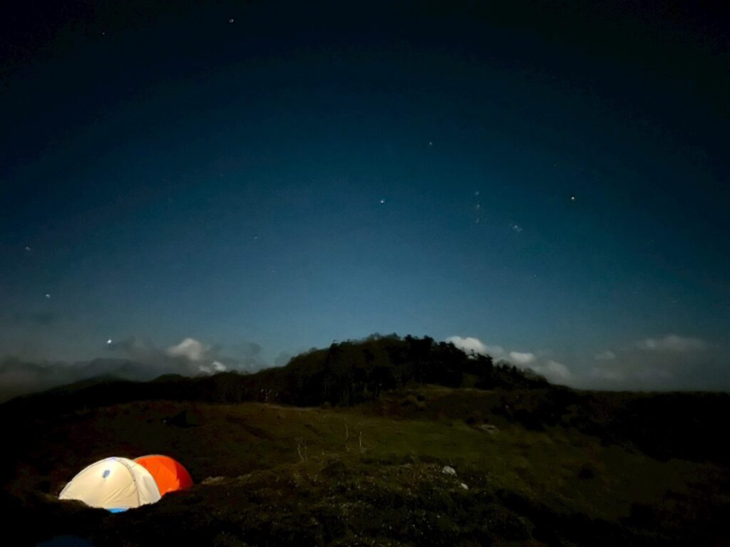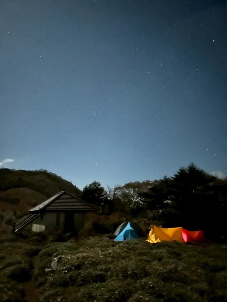 夜中強風でテントが煽られ、飛ばされないかとヒヤヒヤ