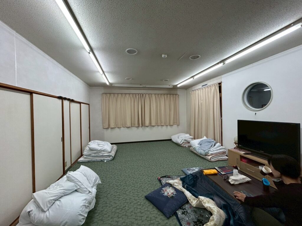 余裕で18帖程ある大部屋にコタツやテレビもあり、5人で使うには余裕ありすぎでみんなそれぞれ好きな場所で布団を敷き一杯やってから就寝