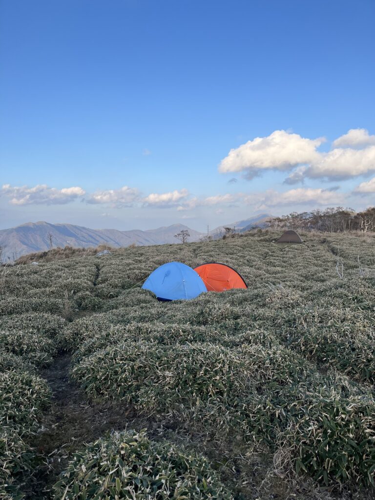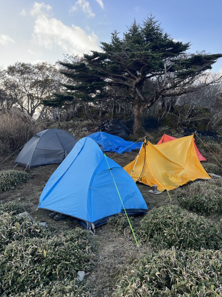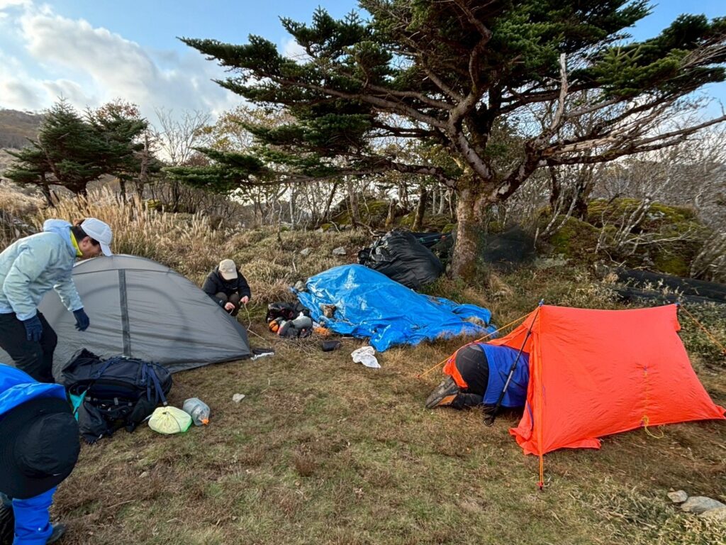ちょうどテントを張る場所を探していたら、同じ日程で逆コースから歩いてきた所属会の大先輩が悠々と現れた。ほんとは三嶺ヒュッテに泊まる予定だったが時間があったから、来ちゃったと。