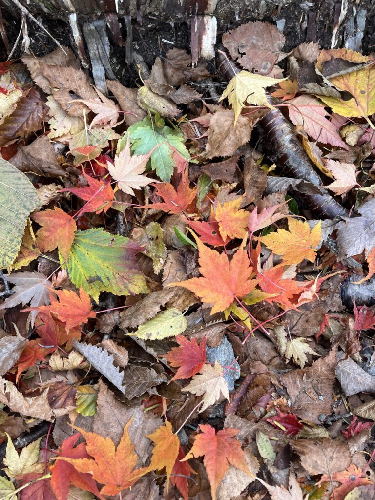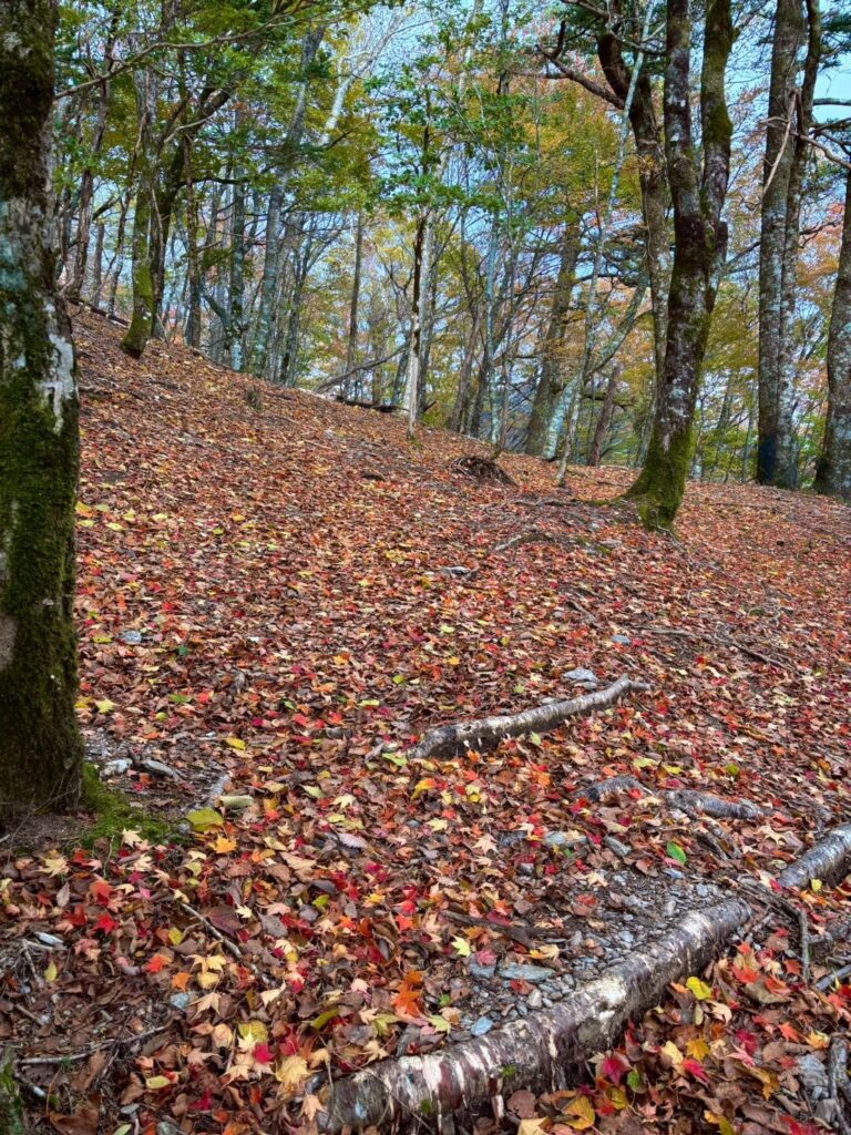 ここからは樹林帯の中の落ち葉ロードをひたすら下り、隙間から差し込む日差しが紅葉を一段と色鮮やかに輝かせ楽しませてくれました