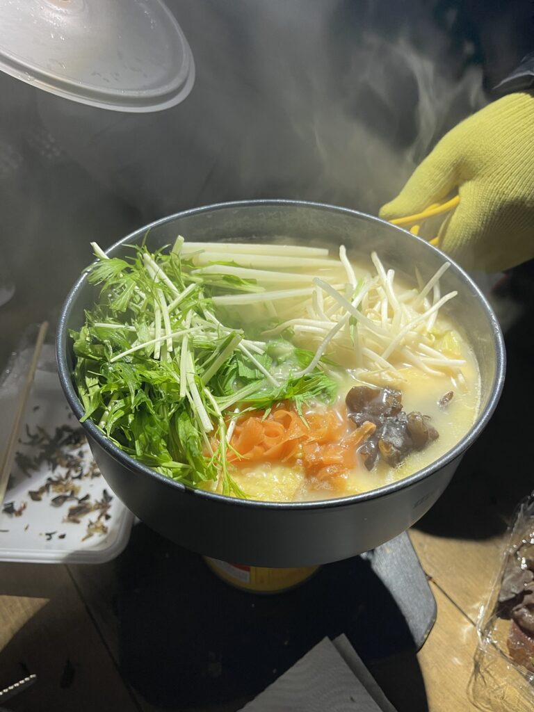 全員同じ食材だったりして~とひやひやしたもの、なんとも彩りの良い美味しそうなお鍋が完成!!三回戦でお腹はち切れそう!!満腹のまま就寝