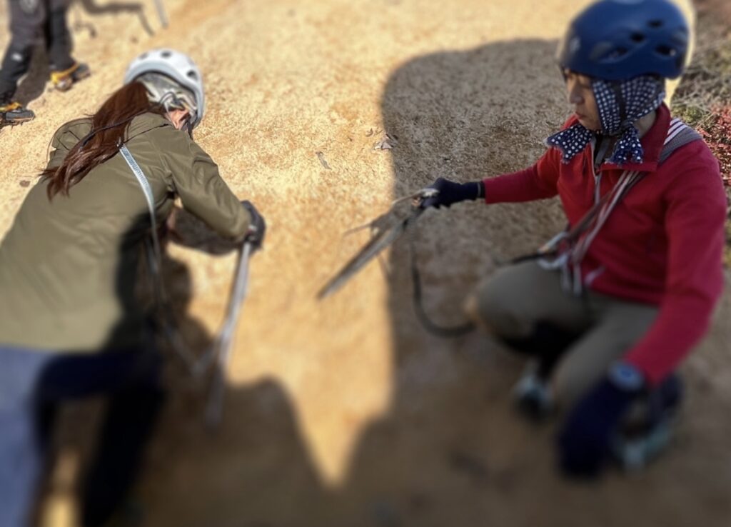 装備の説明、ピッケルの持ち方などの説明がありました。また、これから雪山を始める人に対して知っておいて欲しい注意点の説明もありました。