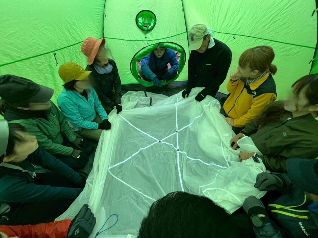 そのあとはテントを建てて、雪山でのテント泊生活の注意点を学びました。