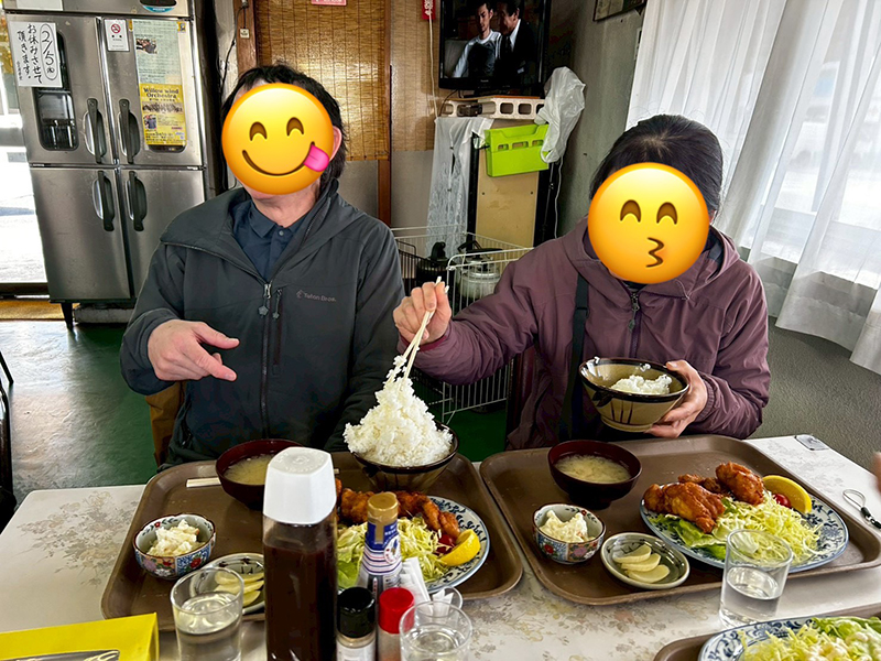 下山めしは近くの食堂でカツ丼や唐揚げをいただきました。こちらの地方ではどこのお店でもご飯もおかずもてんこ盛りなのですね!