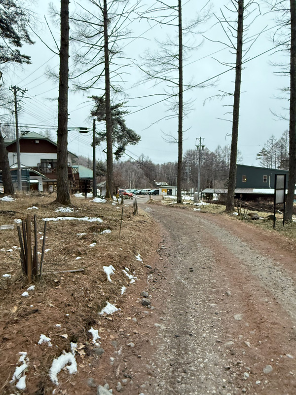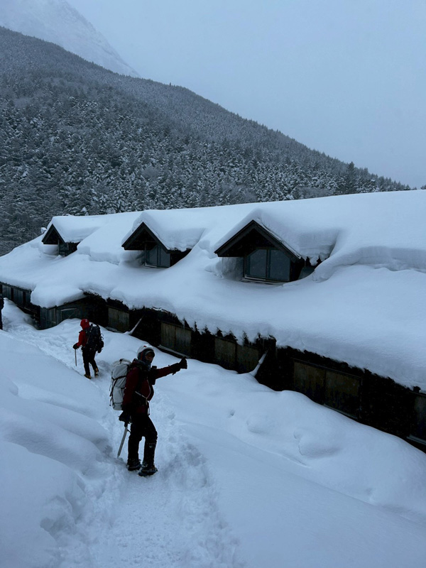 八ヶ岳山荘前は、前日より雪がありました。小屋内で装備を整え、帰路へ。
