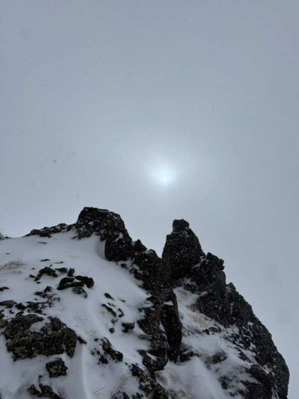 冷たい風に吹かれ続け、汗かきの筆者は少し低体温症気味に・・・とにかく歩き続けないと寒くて留まっていられません。山の周囲はぶ厚いガスが覆い、太陽は遠く・・・早く温まりたい(T_T)