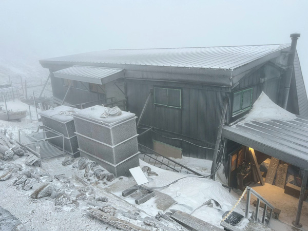 小屋内でアイゼンを脱がせてもらい、受付へ。モンベルカード提示でステッカーをもらえます。