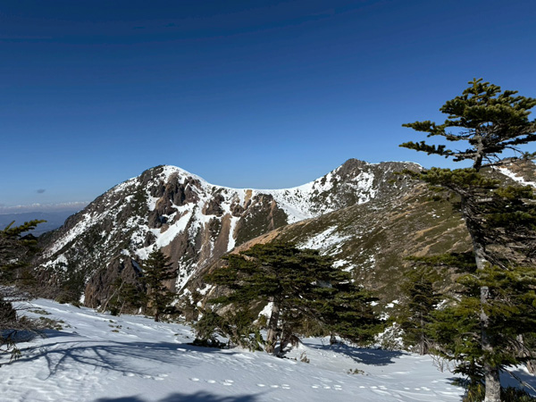 箕冠山頂から東天狗・西天狗の尾根が綺麗に見えましたが、思った以上に雪がない(T_T)