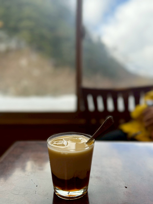 夏沢鉱泉で私たちも臨時便に載せてもらう予定でしたので、1時間待つ間に小屋内でゆずラッシーを頂くことに。豆乳とゆずジャムを混ぜたらしっかりおいしいゆずラッシーでした。