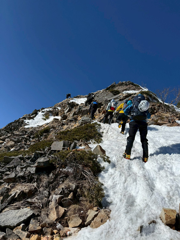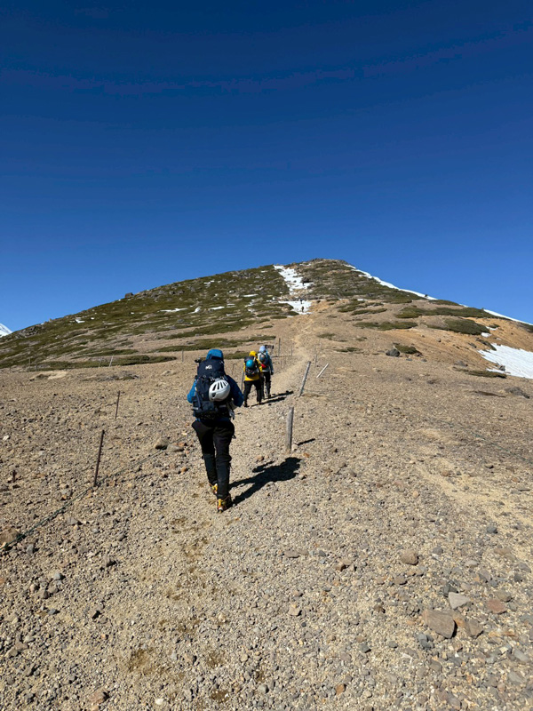 とはいえ根石岳には雪も見えていましたし、アイゼン脱ぐのもアレなんで、悲しくアイゼンで土を歩きます。