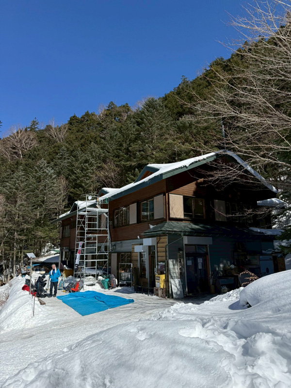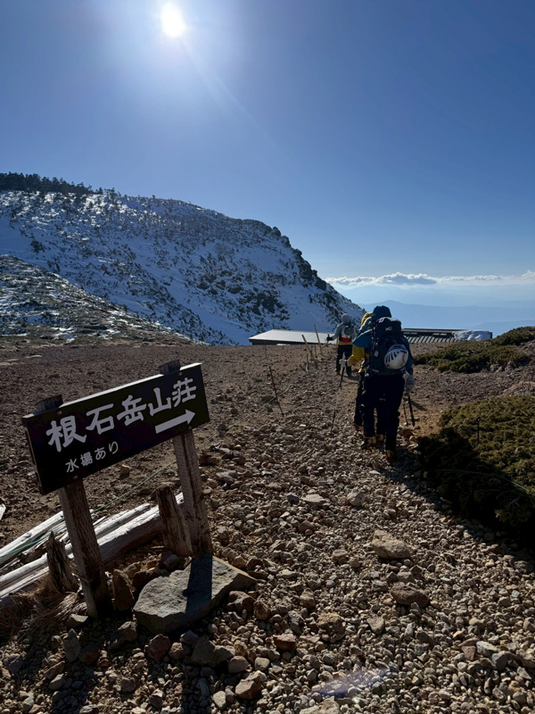 根石岳山荘前も土が見えて夏山のよう。