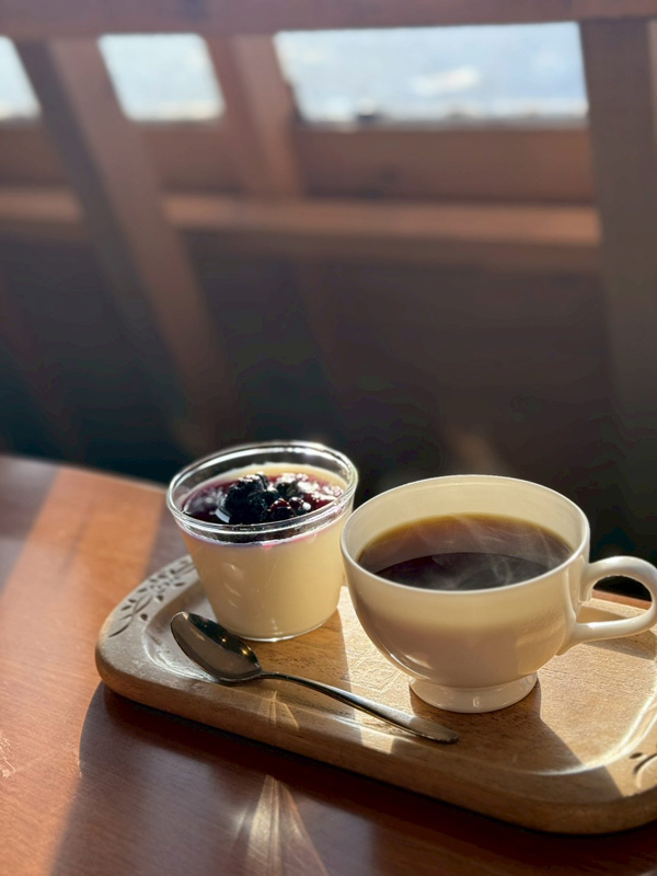 テラスでいただく根石プリンは最高のご褒美でした。