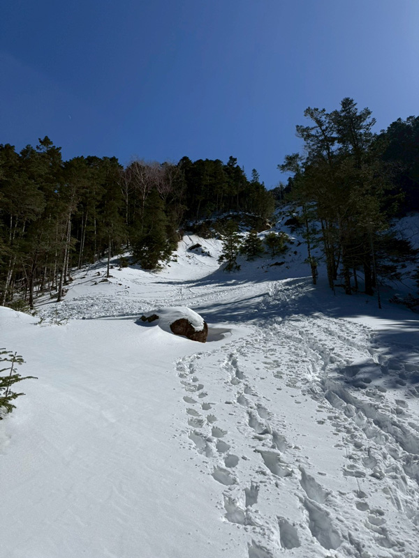 オーレン小屋を過ぎて夏沢鉱泉近くのルートから外れたところに、何やら氷瀑があるらしい。硫黄岳も取れなかったことだし、時間もあるし行ってみようということで小一時間ほどの寄り道をしました。