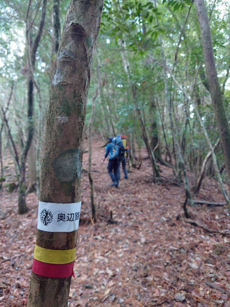 最後のピーク1114m果無山の果無峠は、高野山と熊の報道を結ぶ小辺路との合流点。出発から20kmは登山者と会っていない。小辺路を歩いてやっと登山者と出会う。そして果無峠から道がふかふかでなくなった。
