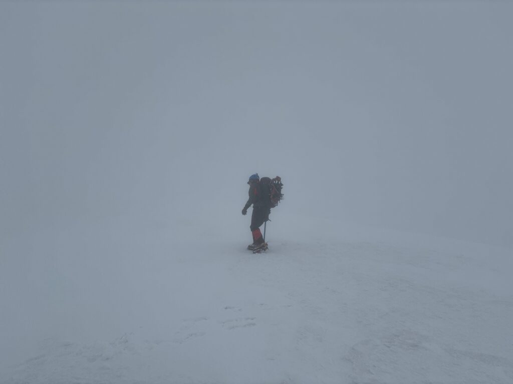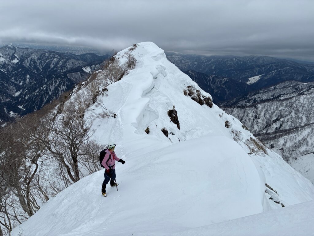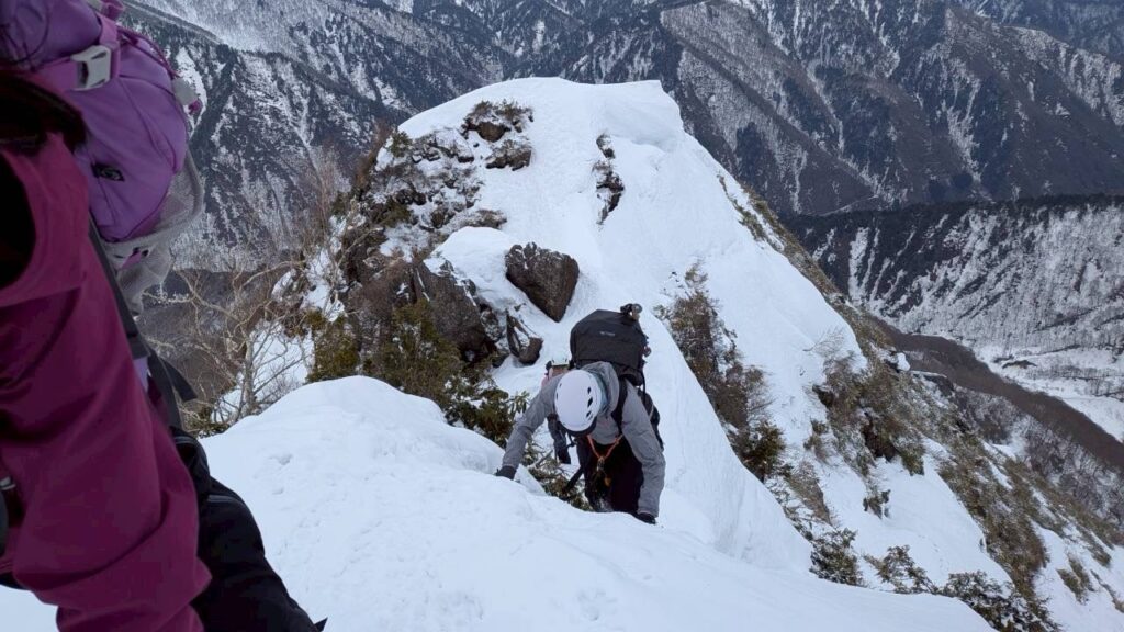 雪庇の細尾根と雪壁のローテーション。肩の小屋に着く頃には視界が悪く、風も強くなっていました。